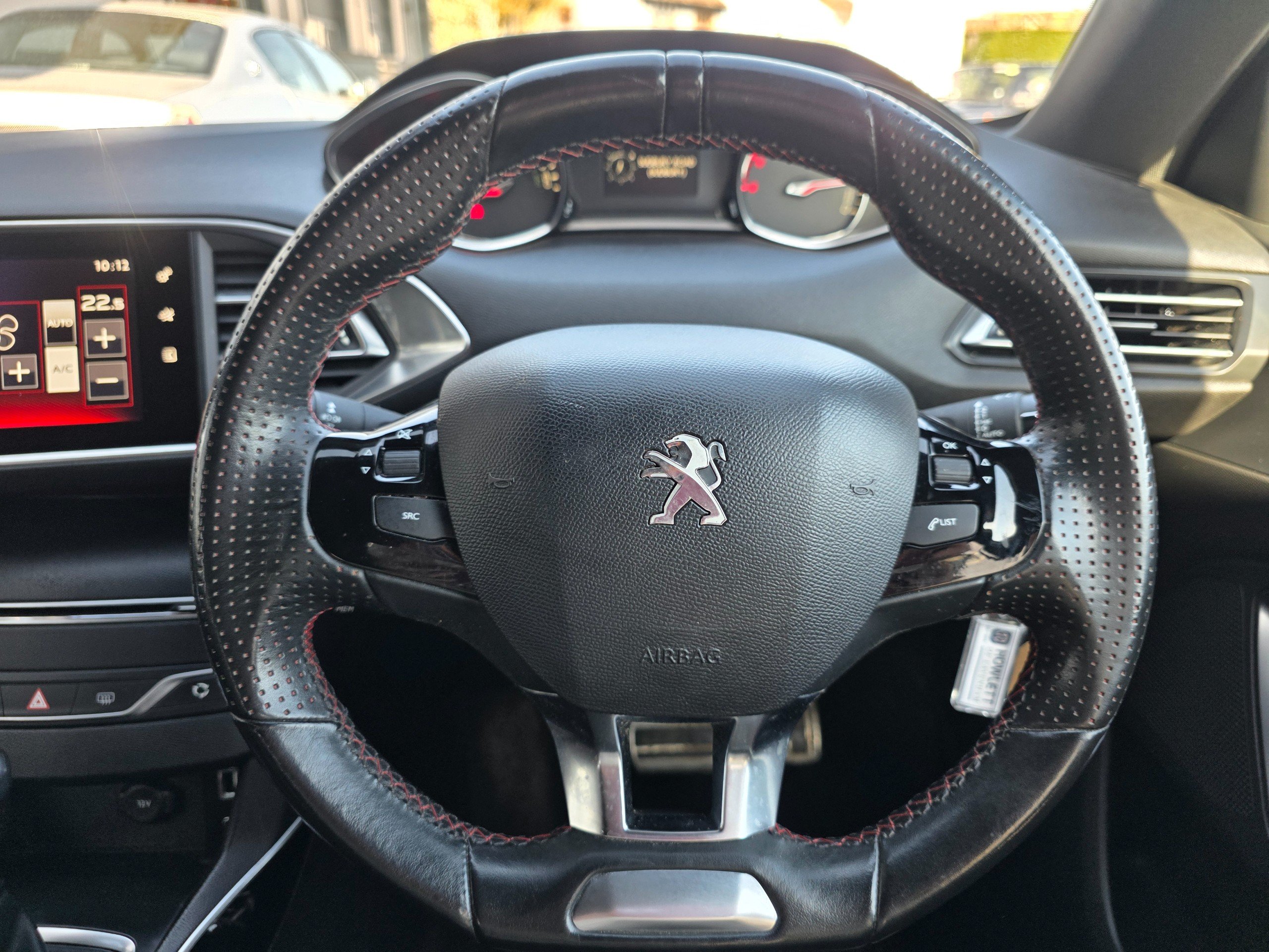 - Leather steering wheel with red stitching